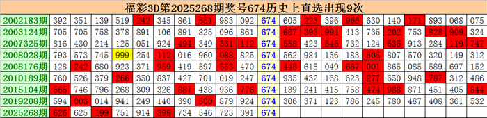 直选号码674历史上开出了9次,其下期分别开出奖号:605、667、558、562、448、935、139、306。