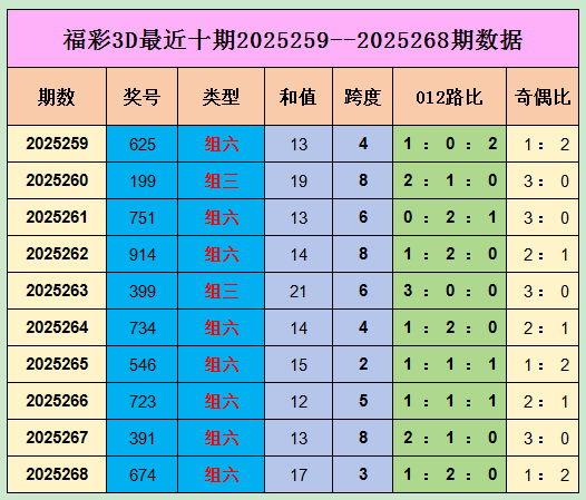 上期回顾:上期开出奖号674,奖号为组六形态,和值17,跨度3,奇偶比1 : 2。
